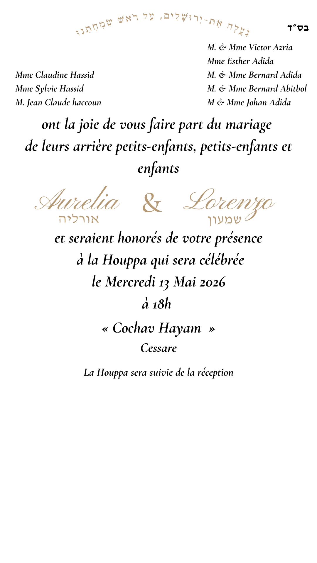 Les familles Slakmon et Scemama seraient heureuses de vous recevoir pour le Chabbat Hatan de